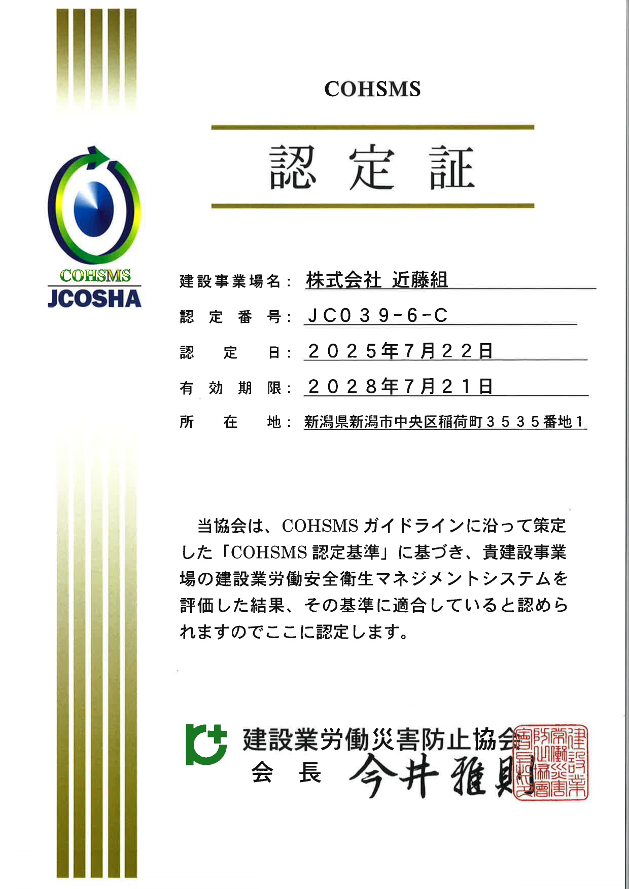 平成21年に創業70周年を迎えるにあたり、今後業界全体はさらに冷え込む中で「安全」を守ることが生き残るために必要だと見据え、同業他社に先駆け、安全衛生管理の社内強化を図るため建設業労働安全衛生マネジメントシステム「COHSMS(コスモス)」の認定取得を決断。平成22年7月新潟県で初の認定取得を果たす。